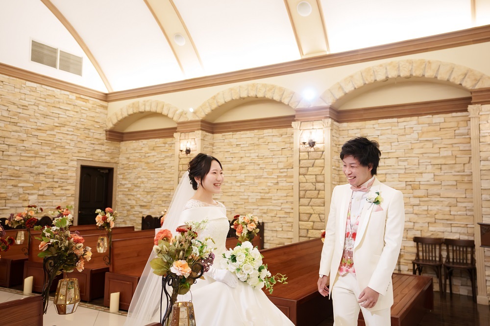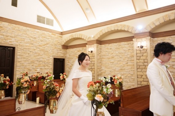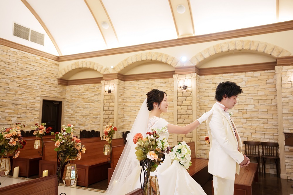 ご新郎様が先にチャペルに入り、ご新婦様がご新郎様の肩をトントンで向かい合います♡