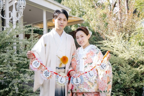 まずは、「結婚しました」のガーランドや「夫」「妻」の扇子を持ったお写真です。