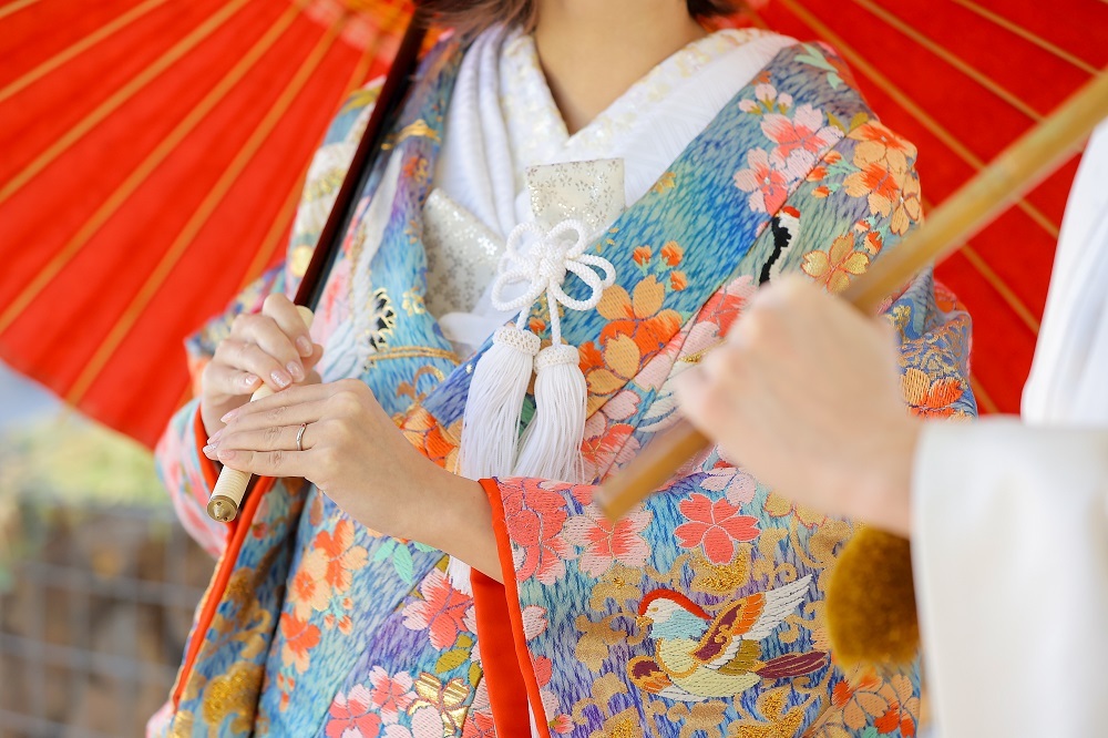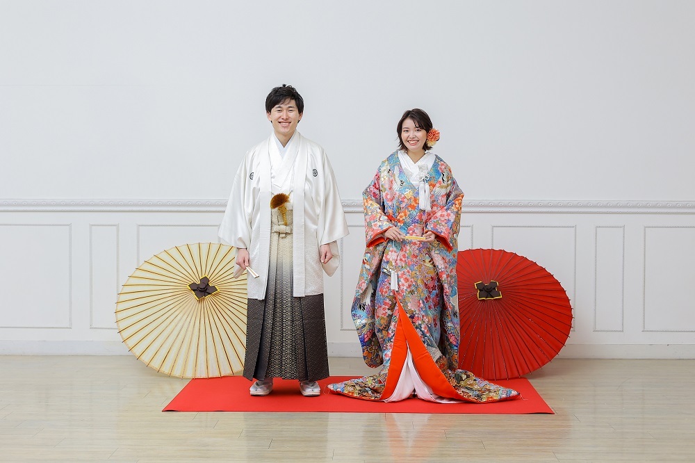 このように、ご新婦様の色打掛がカラフルなときは、ご新郎様の紋付袴は白やオフホワイトなど落ち着いたお色味がいいですよ♪