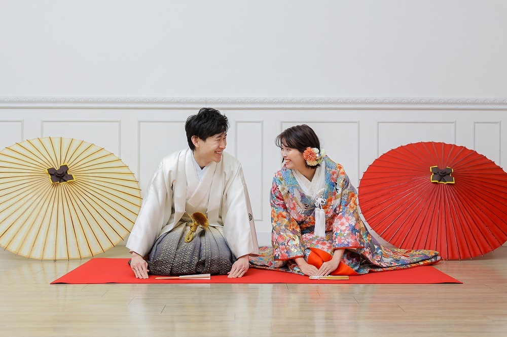 壁が白色なこと、床も薄めの茶色だからこそ、おふたりのお衣裳の色や番傘など、しっかりと映えます☆彡
