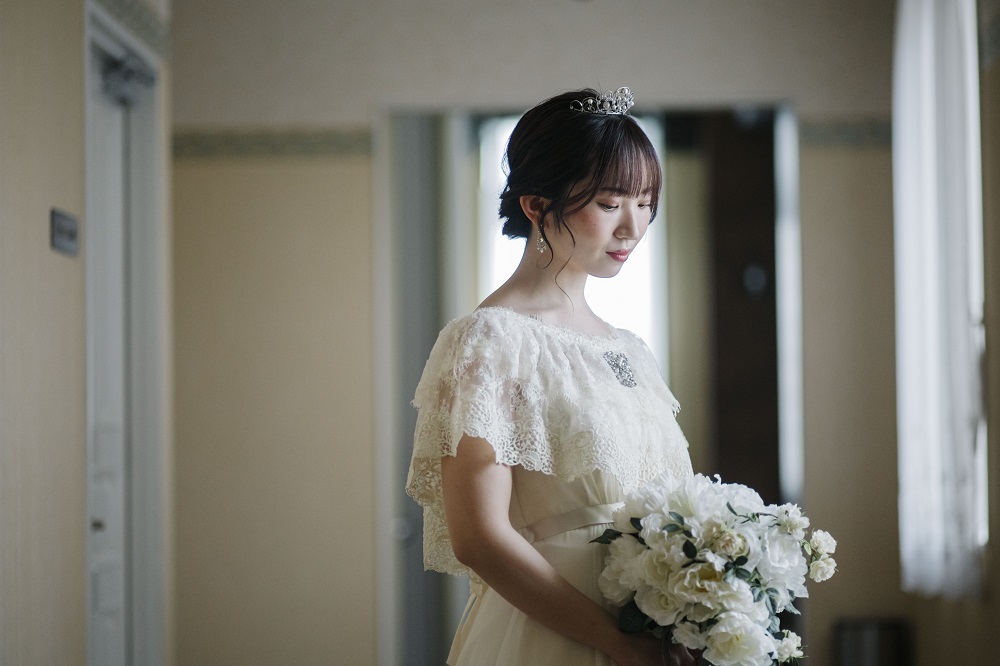 ナチュラルテイストのウェディングドレスで後れ毛を多めにしました。