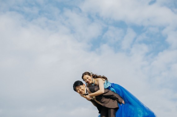 小高い丘になっているので、周りのビルや木が写らず、おふたり+空が広がっています。