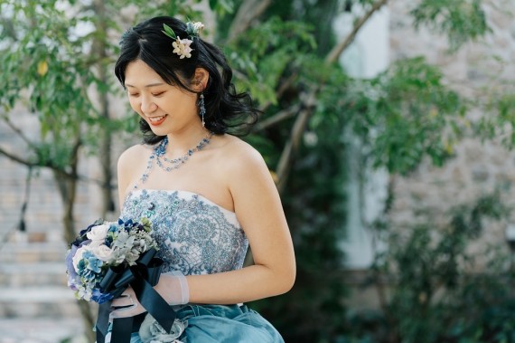 髪飾りもブーケ同様、ブルーでまとめ、ハーフアップに。