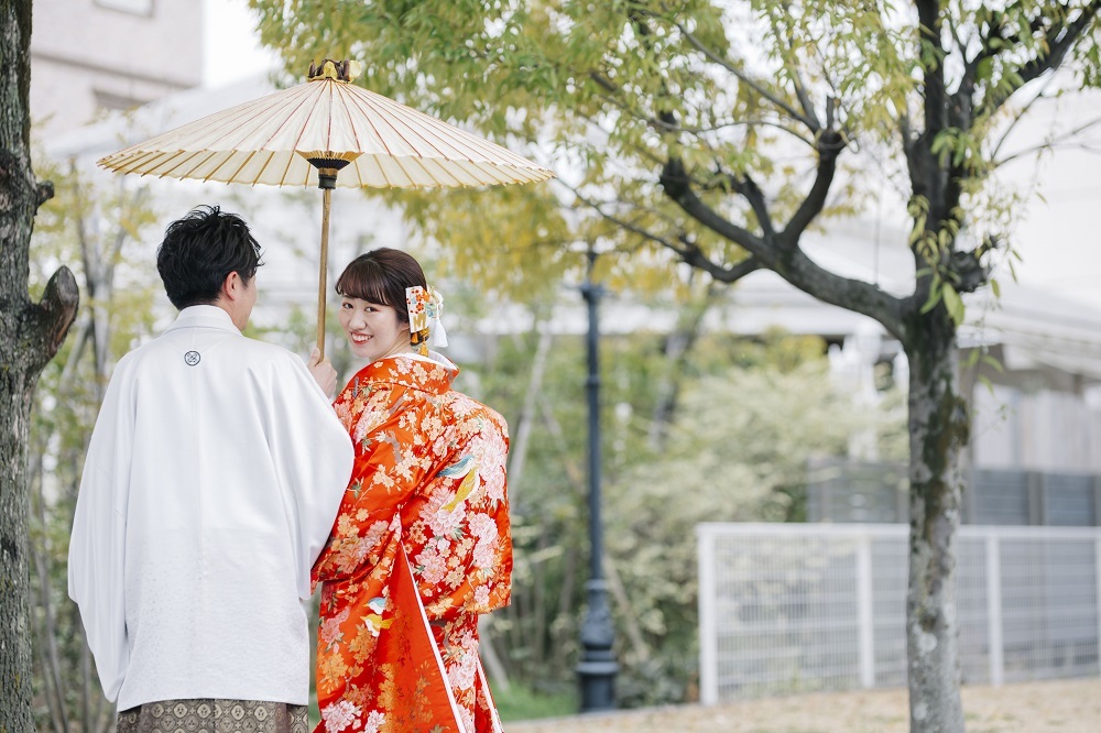 真っ赤な色打掛のご新婦様がご新郎様の腕を組んで…とっても可愛いです°˖✧