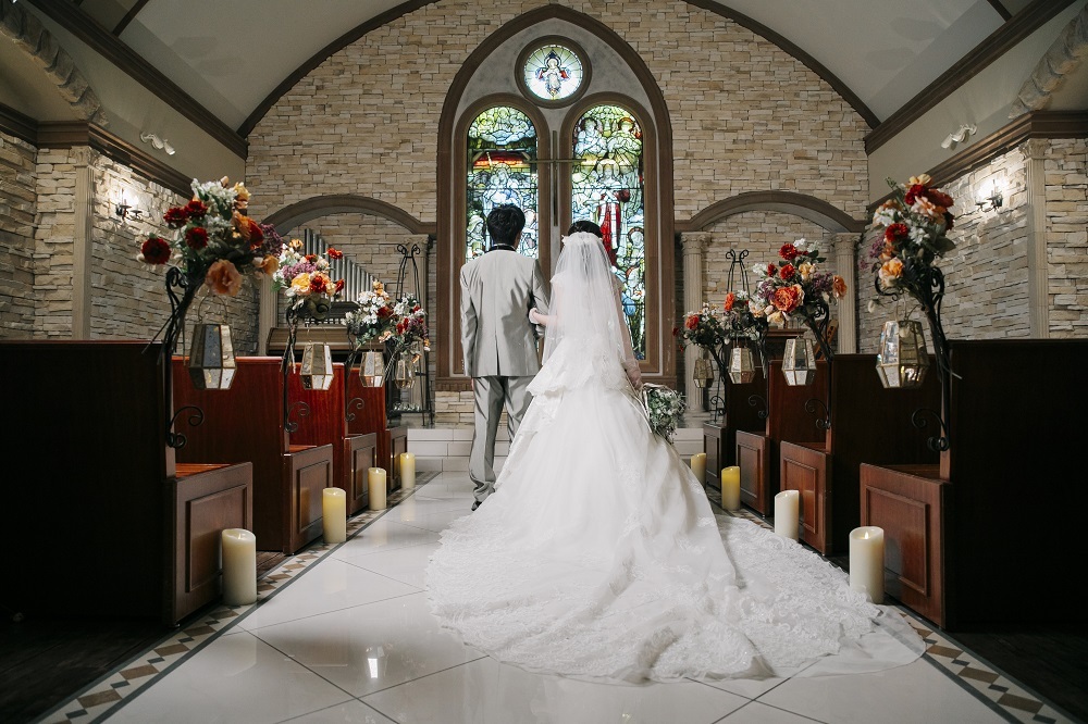 1枚めのお写真は、おふたりの後ろ姿をチャペル全体を映しながら…