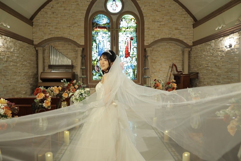 フォトウェディングだと、チャペルの前でこのようにふわっとさせるととっても幻想的なお写真になるんです。