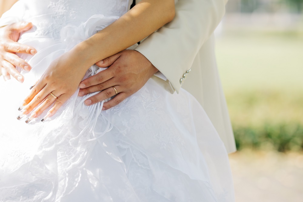 ご新婦様のお腹をご新郎様が後ろからたいせつにハグします♡