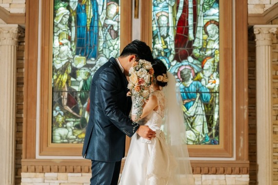 ご新郎様の白タキシードと被せると、お写真のアクセントになり、ドレスと同系色でまとめると、統一感が出ますよ☆彡
