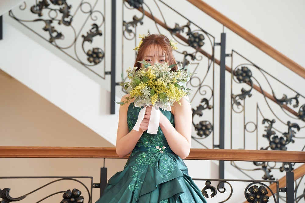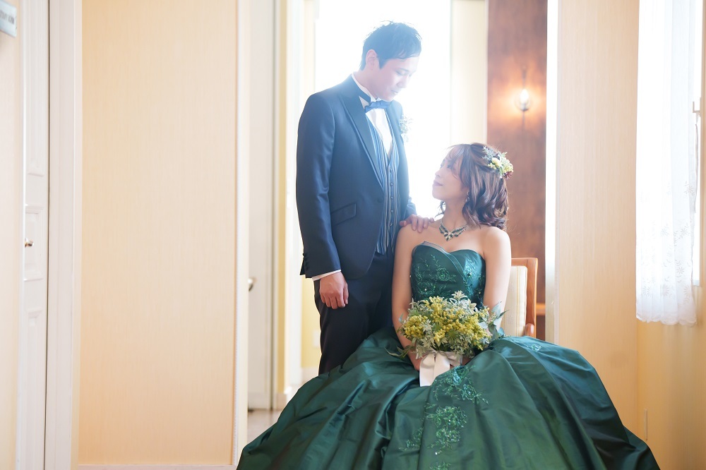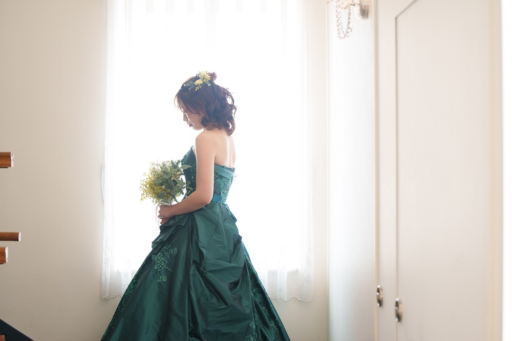 今回は、大人っぽいグリーンのカラードレスをご紹介します。