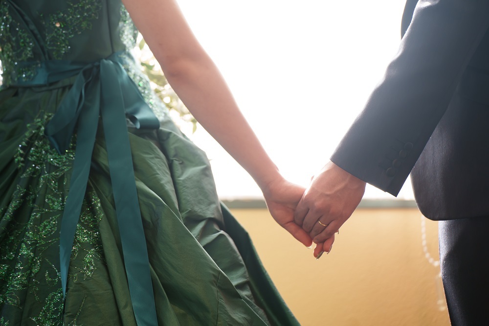 このようなショットは、「手を繋いでいるショット」としても「衣裳をアップで映して、しっかり魅せる」ために残してもいいんですよ◎