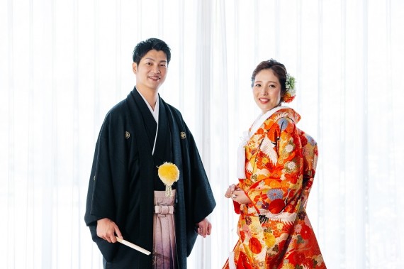 和装撮影をするときには、ご新郎様は「紋付袴(もんつきはかま)」を、ご新婦様は「色打掛(いろうちかけ)」もしくは「白無垢(しろむく)を着用します。