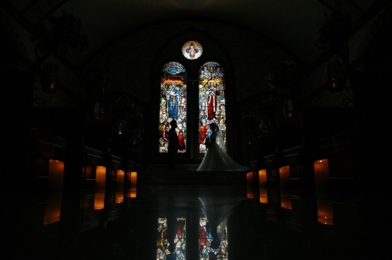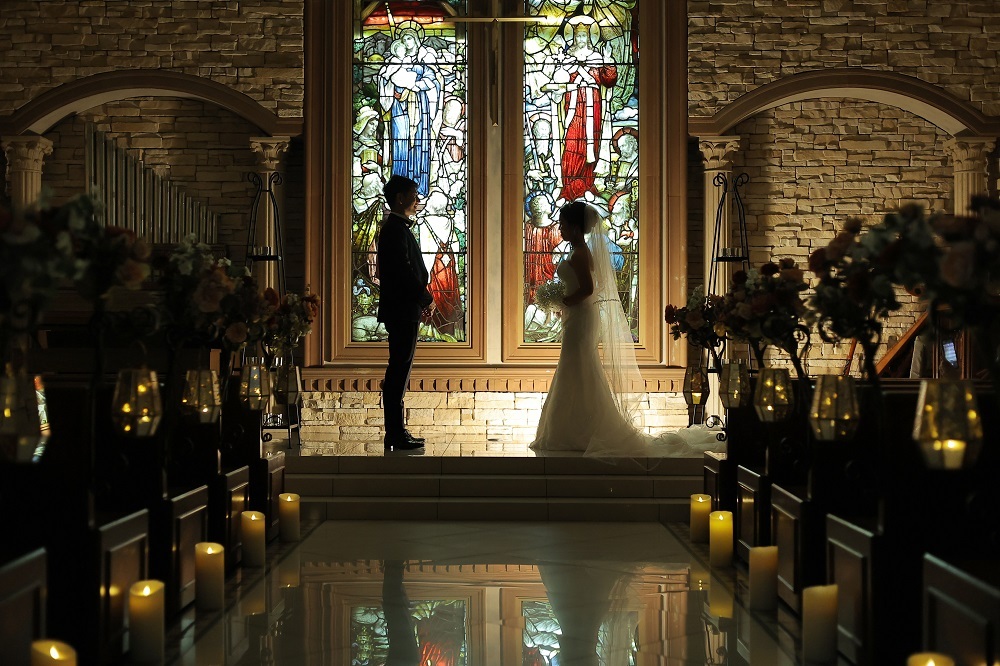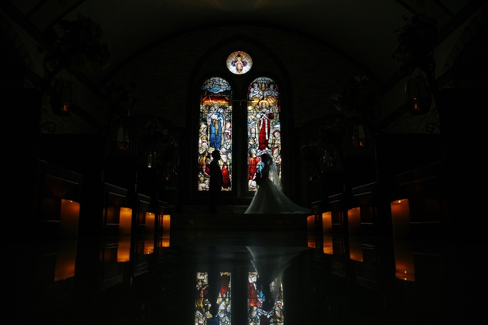 照明をぐっと落とし、おふたりがステンドグラスの前でシルエットになるような構図です。