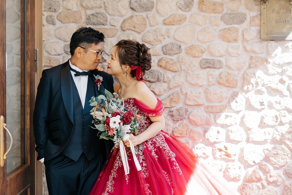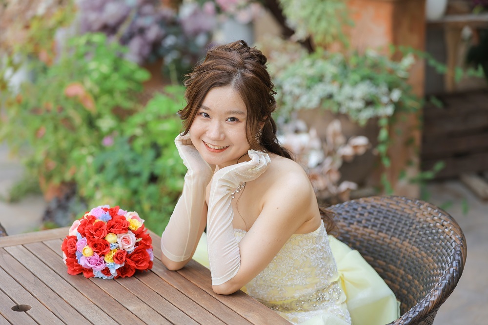 パステルイエローのドレスに赤のラウンドブーケがアクセントに。