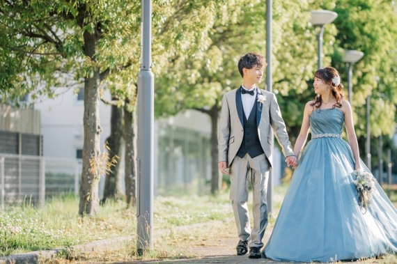 *パステル水色ドレス×グレー&ネイビータキシード*