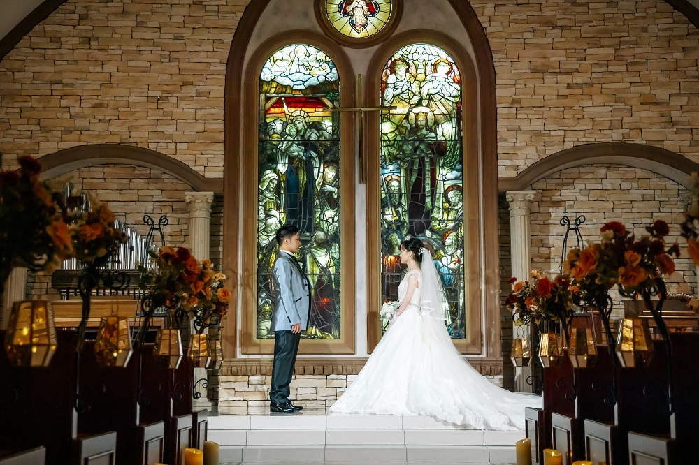 ウェディングドレスでは、いよいよステンドグラス輝くチャペルにて撮影しました☆彡