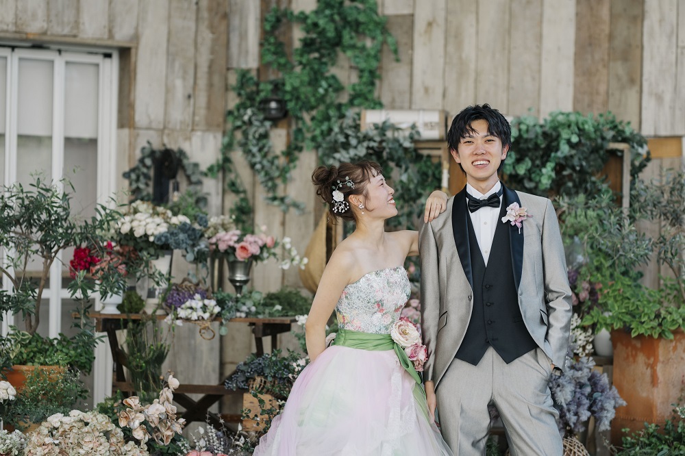 ドレスの柄がそんなに多くないので、このようにガーデンのお花の前でもドレスが埋もれることなく、存在感を出せます。