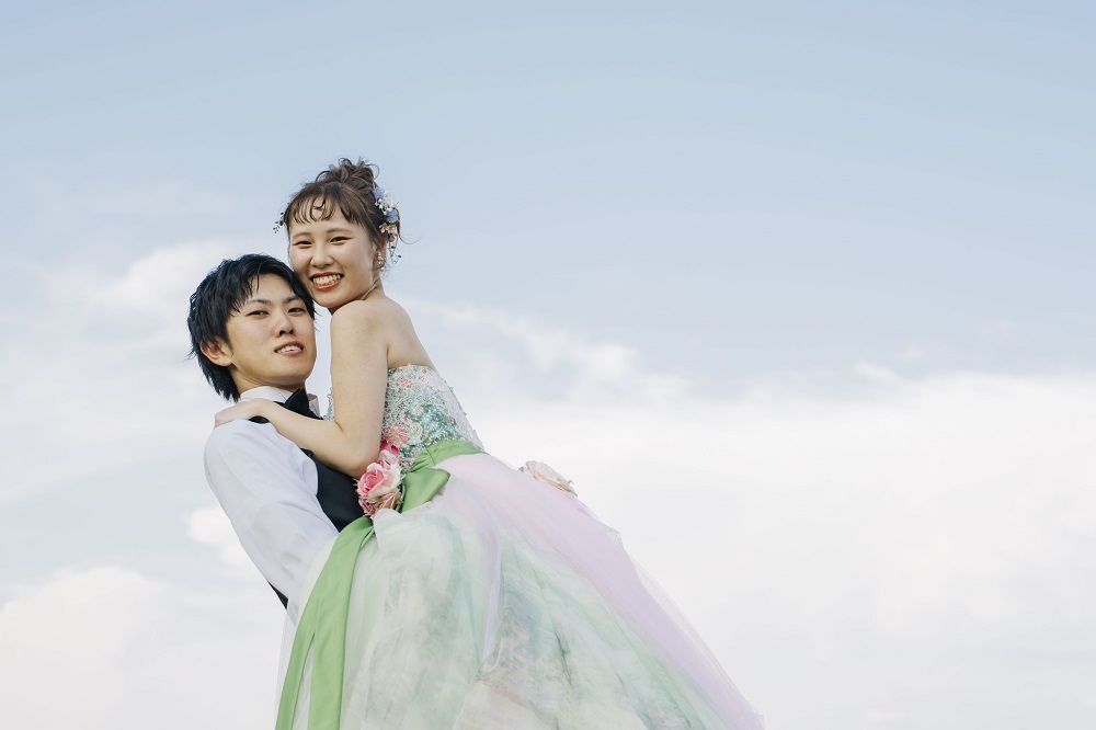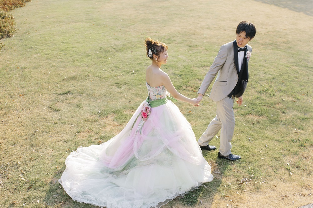 パステルカラーのドレスなので、タキシードは黒や白などパキっとしたお色ではなく、ベージュやグレーなどがオススメ◎