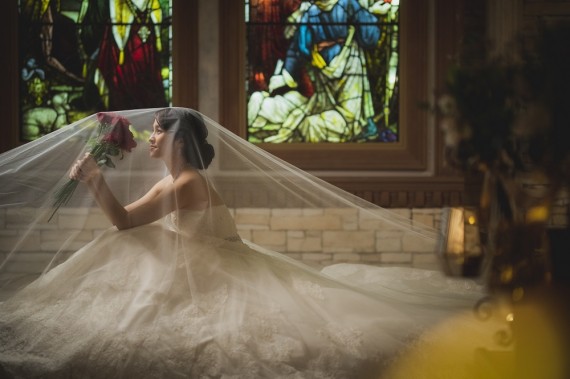 ステンドグラス輝くチャペルなどゲストハウスの結婚式場で撮影するからこそ味わえる”ソロウェディング”。