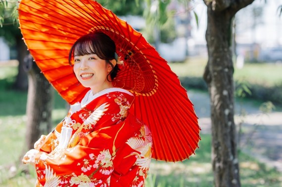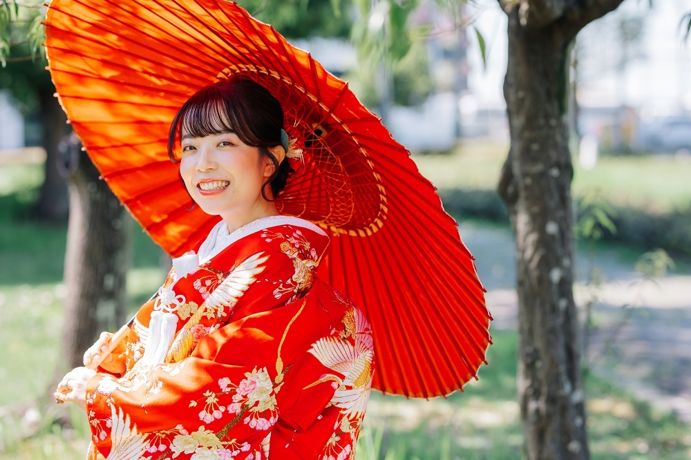番傘、髪飾りまでも赤に統一しました◎