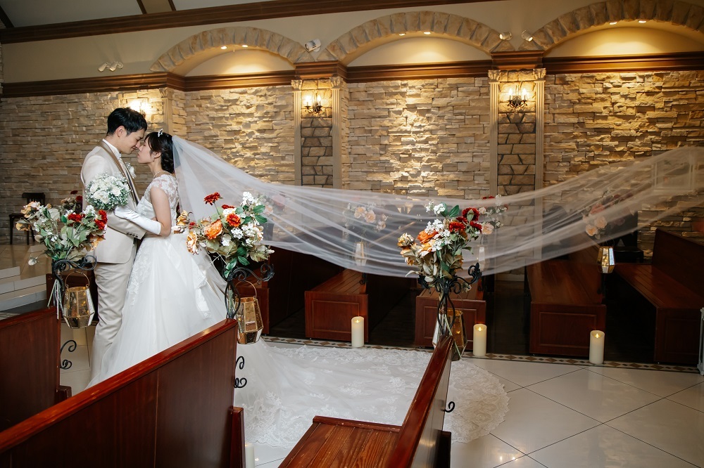 おふたりがバージンロードに並び、ベールをふわっとさせたベールショット。