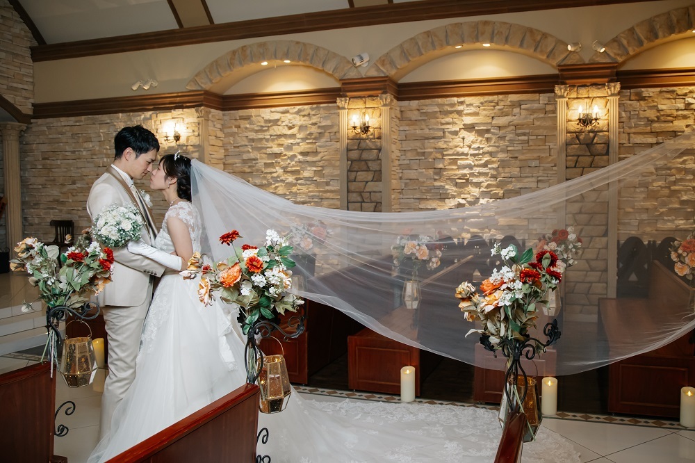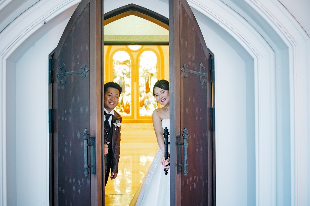 そのため、本格的なステンドグラス、重厚感のある扉などがあり、天井がアーチ状になっているので、奥行き感も出したお写真を残すことができます。