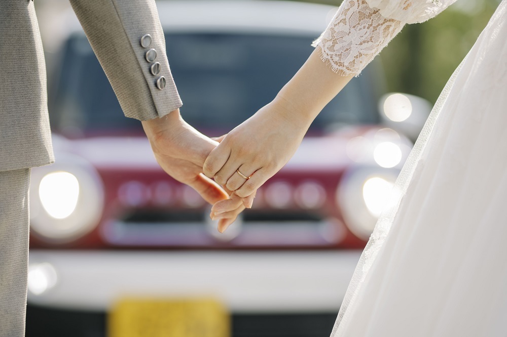2枚めにはバックに愛車も映っており、おふたりならではの1枚に。