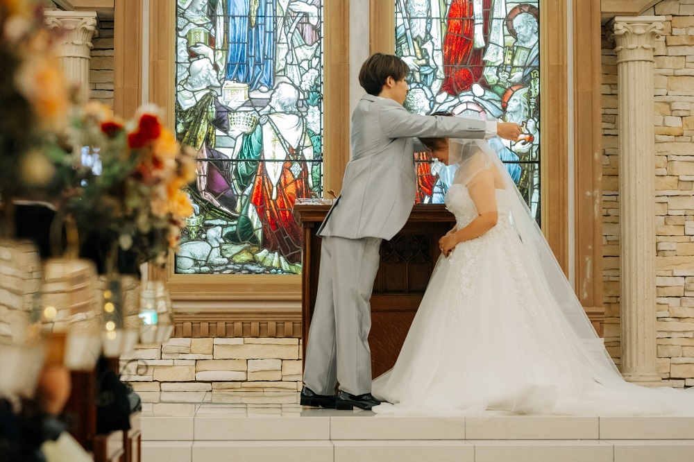 そして、チャペルのステンドグラスを背にすると、このようなお写真が撮れます。