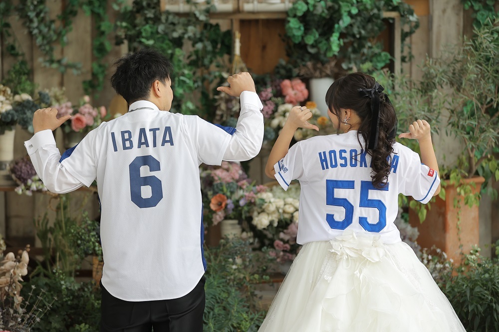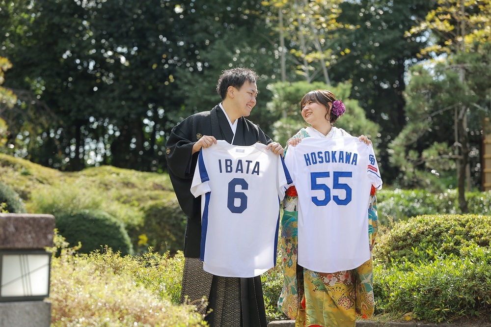 こちらのおふたりは、好きな野球選手のTシャツをお持ち込みいただき、和装・洋装どちらも撮影しました!
