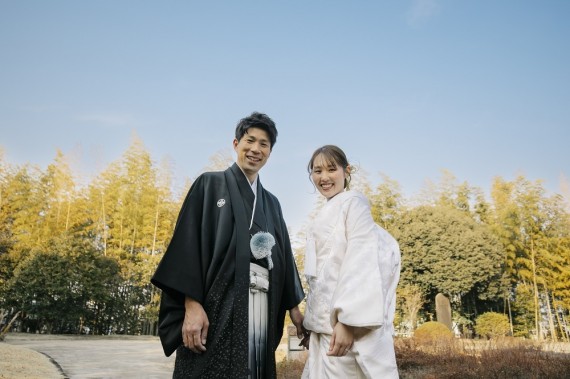 おふたりが手前にきてその後ろに竹林、さらに青く澄んだ青空が広がるという、ロケーションならではの1枚。