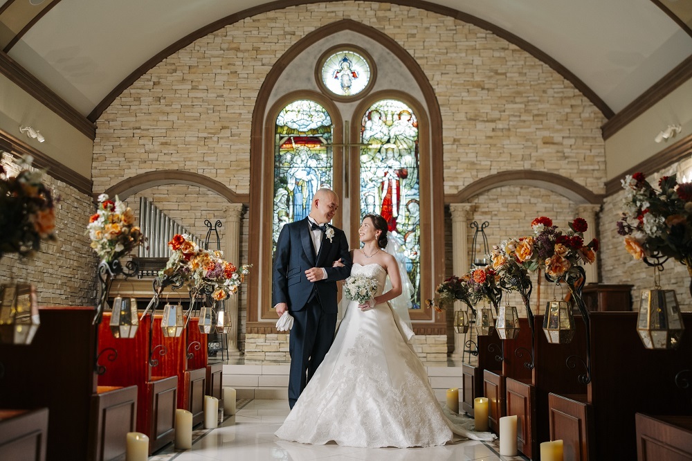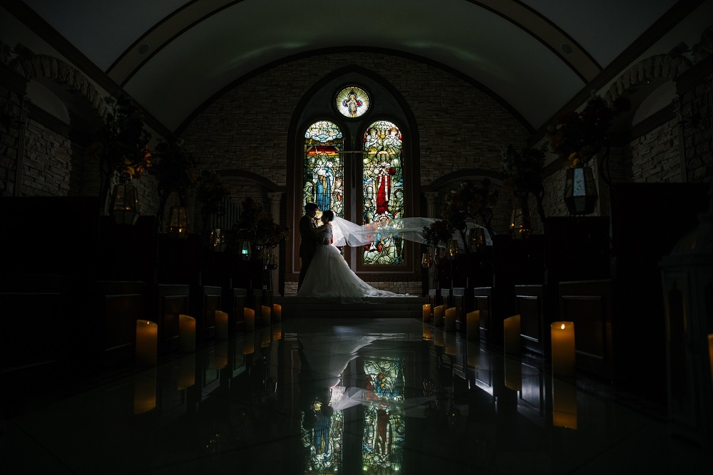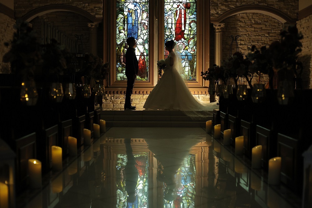 もっとシルエットを強くしたい!という方は、バージンロードのキャンドルとステンドグラスの照明だけというものオススメです◎