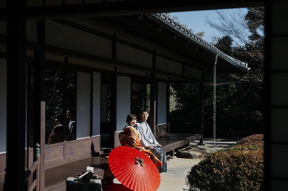 まずは、スタジオから車で15分ほどの場所にある、日本庭園「丈山苑」にて撮影。
