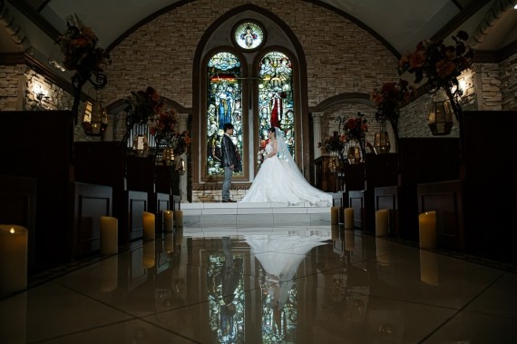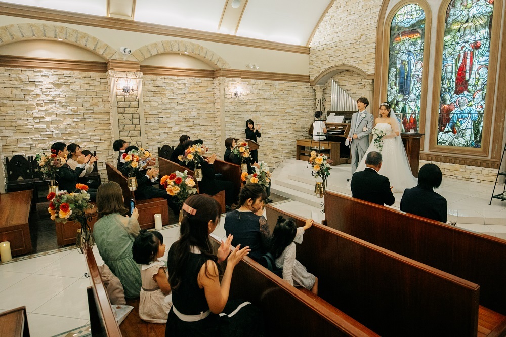 七色の光輝くステンドグラスが、あたたかい光でおふたりを包み込みます。