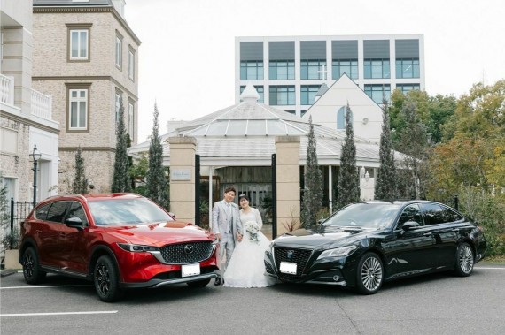 結婚式場で撮影できるというメリットを活かし、広いガーデンでの愛車とのフォトウェディングをお楽しみいただきました♡