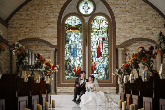 真っ白なバージンロード、石造りの壁、アンティーク調の椅子や小物、そして光り輝くステンドグラス。