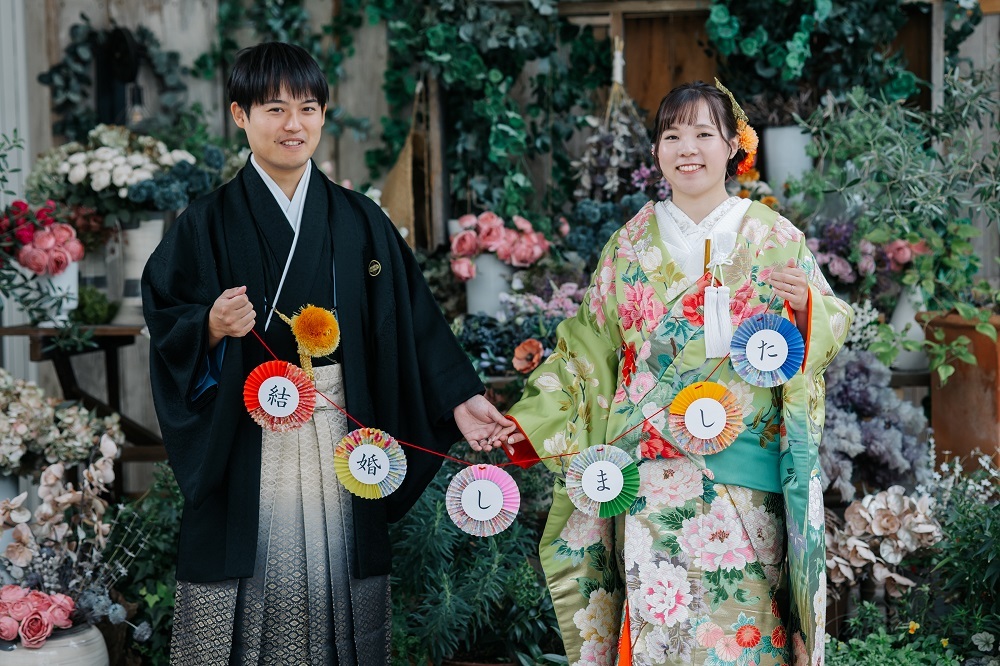グリーンと、暗い色の紋付袴を合わせると、よりシックでかっこいいイメージに!