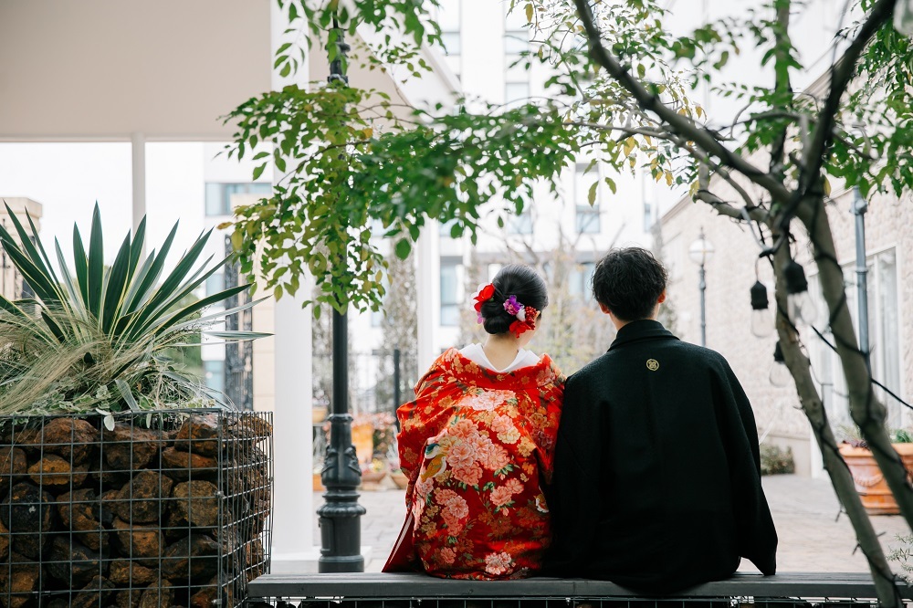 正面から撮ると、後ろに大きな木があり、ナチュラルな雰囲気に、後ろから撮るとこだわりのお衣裳がしっかりと映る1枚に。