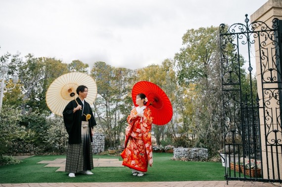 黒の紋付袴を着用したご新郎様ろ並ぶと、色のメリハリがしっかりとついていてGood◎