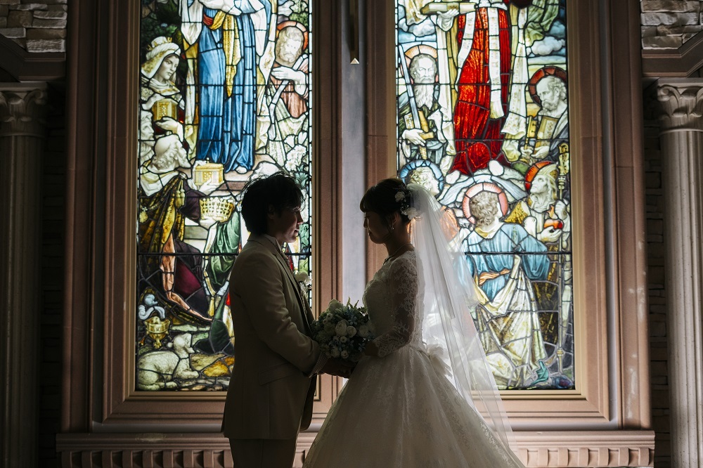 純白のウェディングドレスを着て、ステンドグラスの光におふたりが包まれて、結婚!と一目見てわかるお写真ですよ☆彡