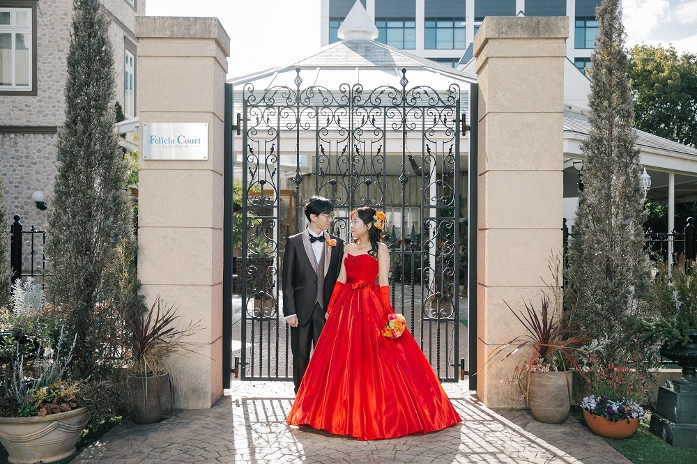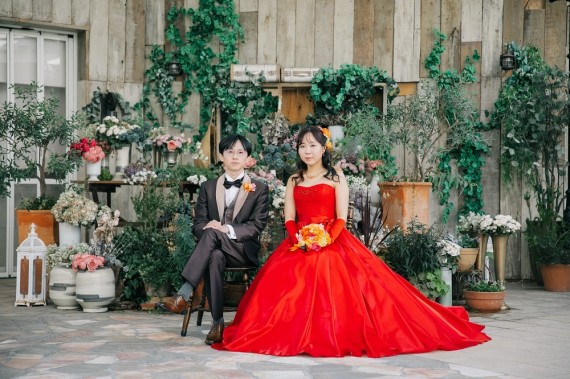 ブラウンや暗めのグリーンのガーデンでは、このような真っ赤なカラードレスがとっても綺麗に映えます☆彡