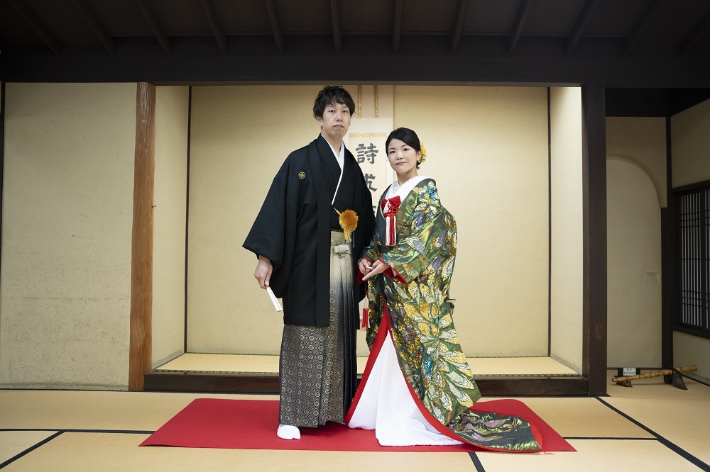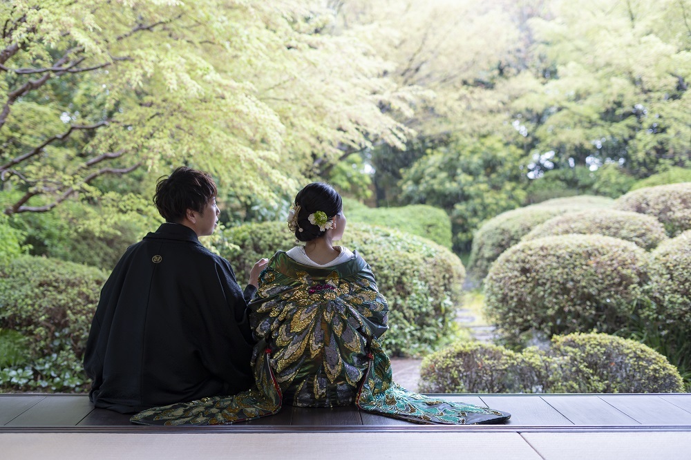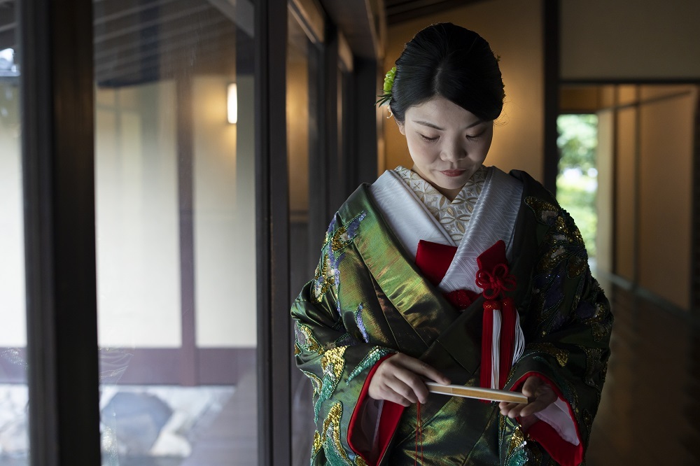 丈山苑の緑に囲まれた自然とぴったりのゴールド×グリーンの色打掛。