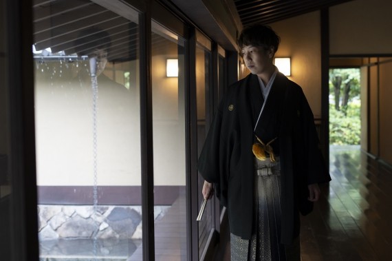 ご新郎様のソロショットは、黒の紋付袴を活かして、照明が少し暗くなった、廊下にて。
