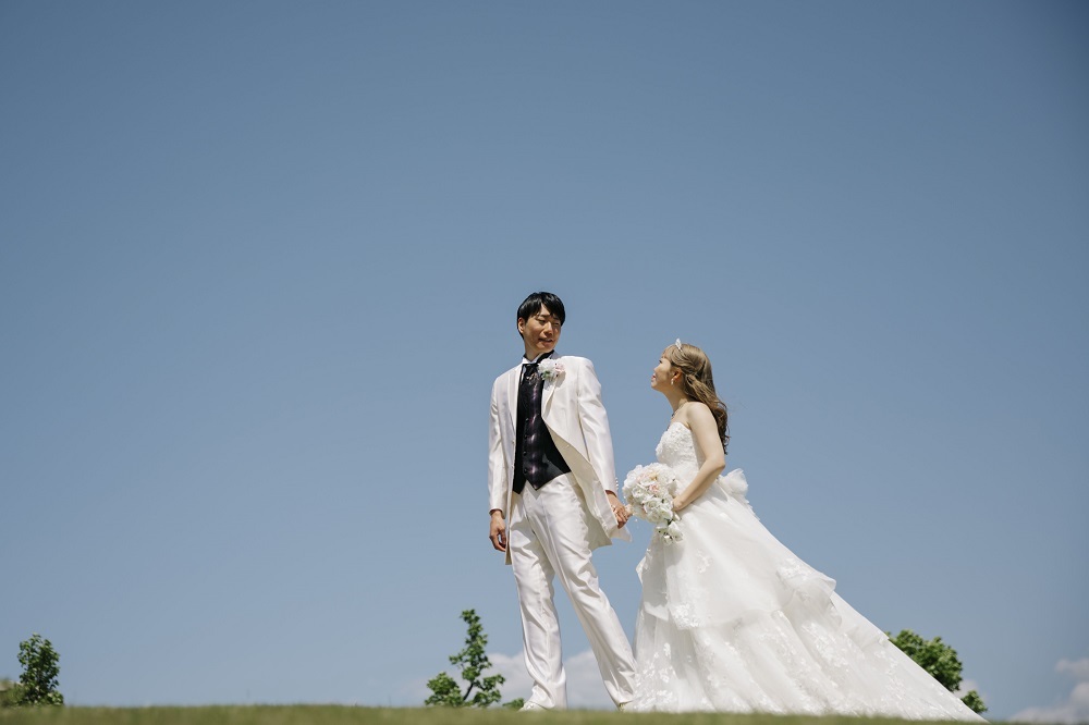 白いドレスとタキシードに、雲一つない真っ青な空。