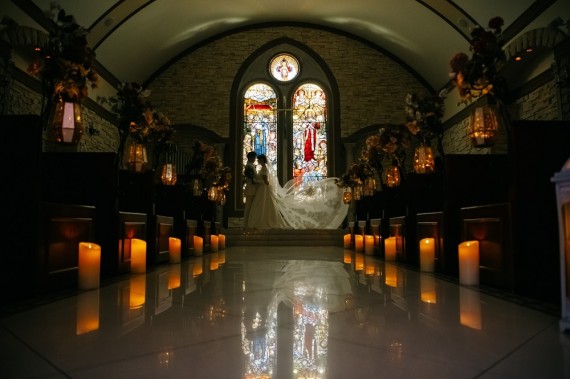 ステンドグラスとバージンロードのキャンドルのみで輝くお写真は、とってもロマンティックですね✨