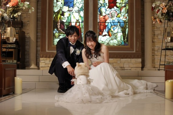 このように祭壇に座っていただいても、しっかりとおふたりの後ろにステンドグラスが映り、おふたりの姿を優しく照らすようです°˖✧