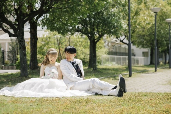 綺麗に整えられた芝生や、木々の緑と、純白のウェディングドレス、タキシードの組み合わせは合わないわけがありませんよね!