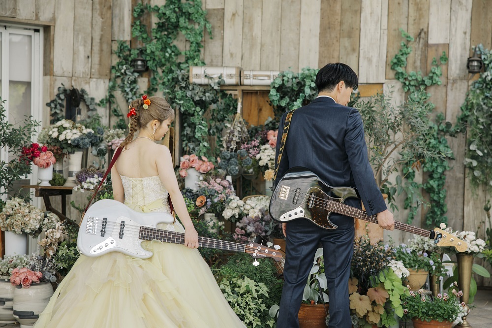 今回は、ウェディングドレスとカラードレスをスタジオにて、そして、推しグッズや楽器をお持ち込みいただいたおふたりの撮影レポートをご紹介いたします!