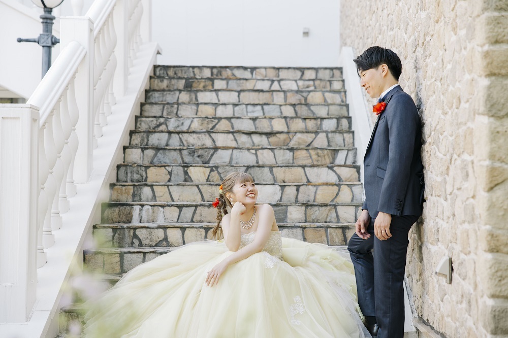 先ほどまでの真っ白なお衣裳のおふたりから一転、イエロー×ネイビーに雰囲気ががらっと変わりました◎
