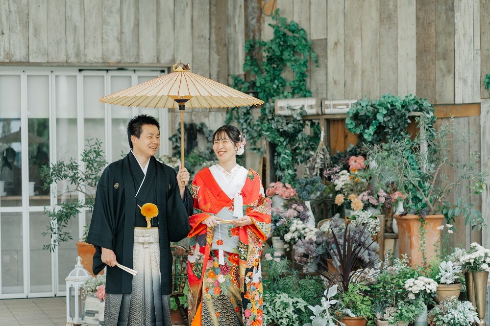 和装の番傘を使用して、可愛らしいおふたりのショットを…!