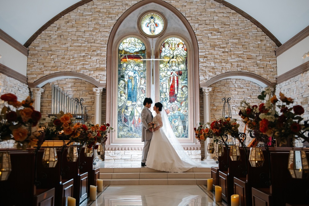 そして、ステンドグラスが高すぎない位置にあることで、どんな角度からのお写真でもおふたりの後ろにいつもステンドグラスが映ります!
