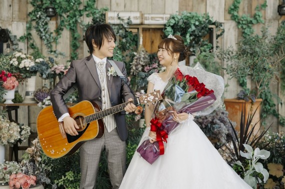 ウェディングドレスやブルー、グリーン系のドレスと撮影すると、ナチュラルテイストに、ピンクやイエロー系のお衣裳を合わせるとキュートな雰囲気になります。